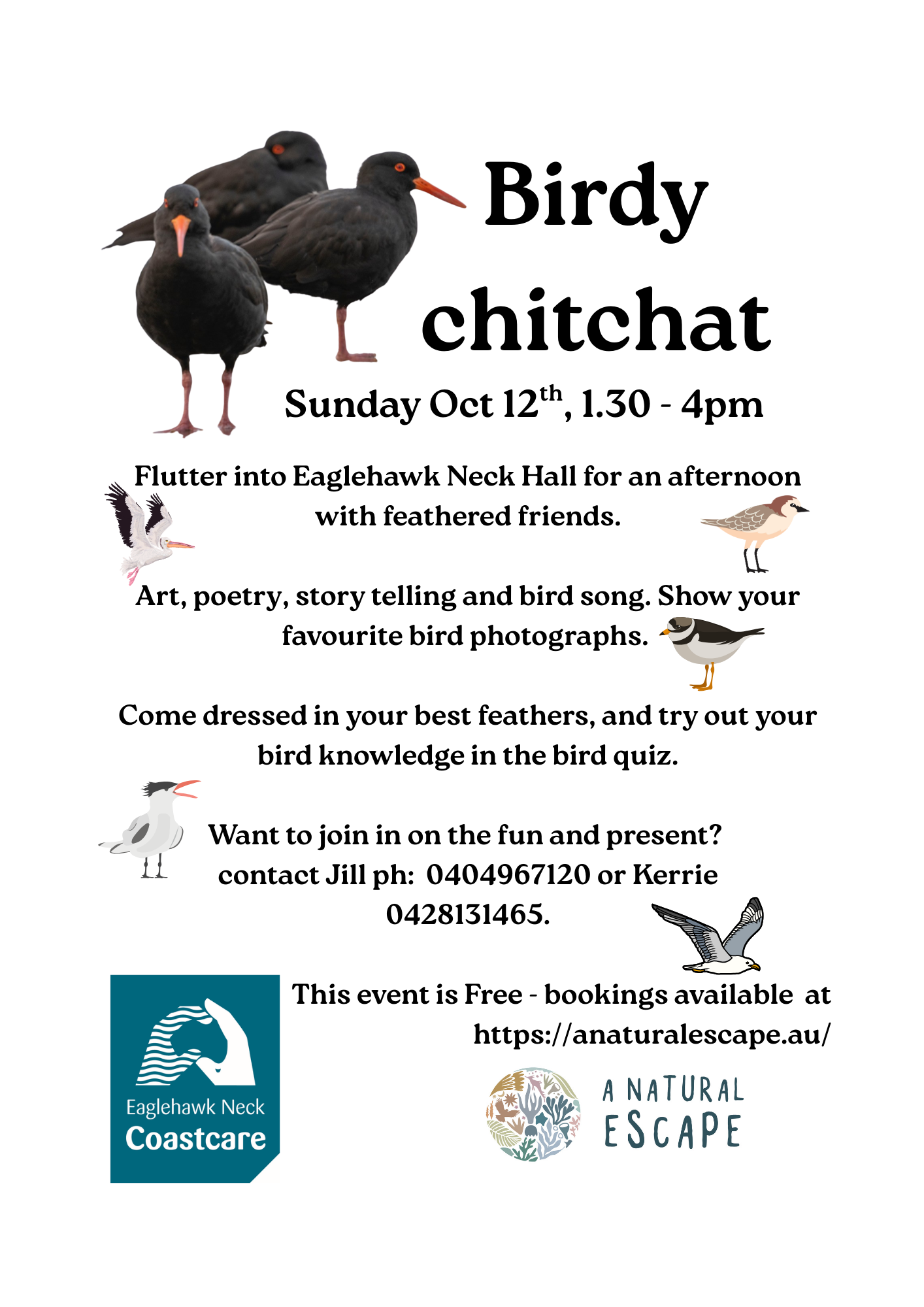 Sunday Oct 12th 1.30pm-4pm Birdy Chit Chat. Fun and relaxing activity for everyone to round out a busy weekend. Come along and show your bird pics, relay bird encounters, and even some art and poetry. We will have a fabulous display of all the bird art that we did at Sandras recent Coastcare workshop. There will be a bird quiz for all abilities as well. Dressing up as a bird is optional. You can also just come along and join in the fun without the pressure of getting up , but any one who would like to show a few photos of birds, please let Jill Pierce or myself know.