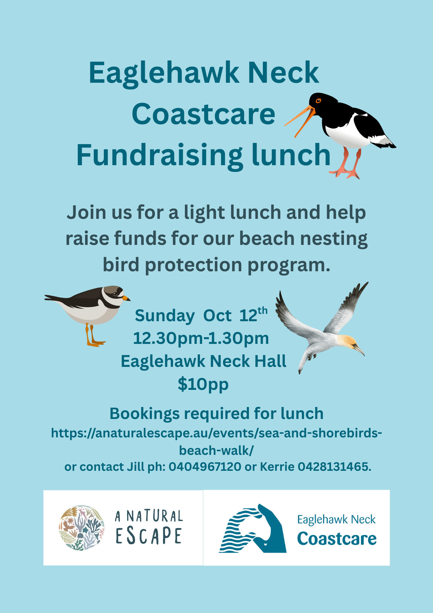 Sunday Oct 12th : 12.30-1.30 Eaglehawk Neck Coastcare Fundraising lunch. $10pp, you can book direct with me if you would like, by emailing me. We do need to know numbers in advance. This is a fundraiser to get some new signs for our beach nesting birds.