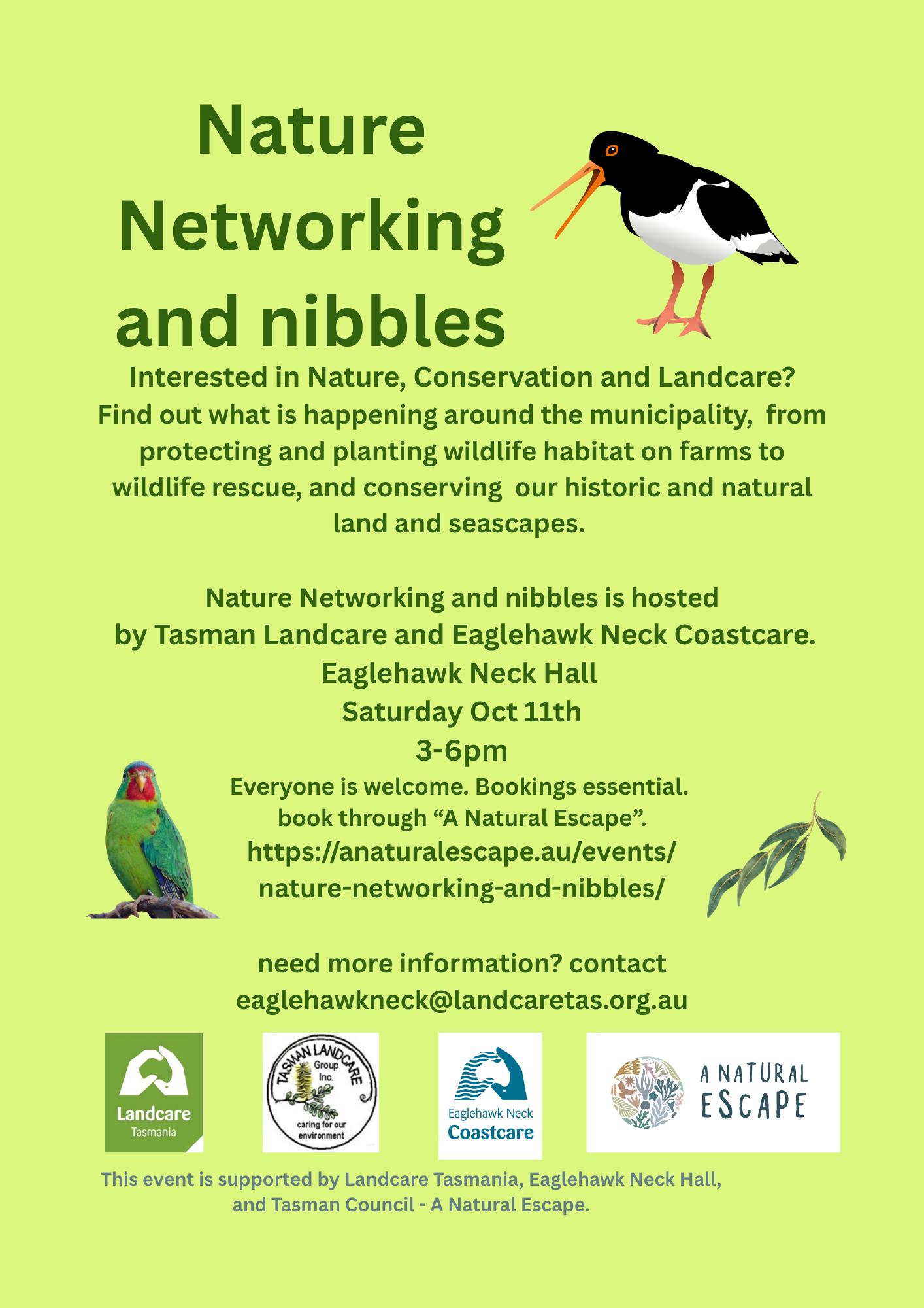 Saturday Oct 11th: Nature Networking and Nibbles – come along and listen to some interesting talks from different organisations operating in the municipality, from Friends of Tasman Island, Tasman Landcare, Eaglehawk Neck Coastcare, Roaring Beach Wildlife Rescue, Landcare Tasmania, Environment Tasmania and more. I also need a couple more Eaglehawk Neck Coastcare helpers to help with the nibbles and set up between 2. 30 pm and 3pm, so let me know and come early if that is you.