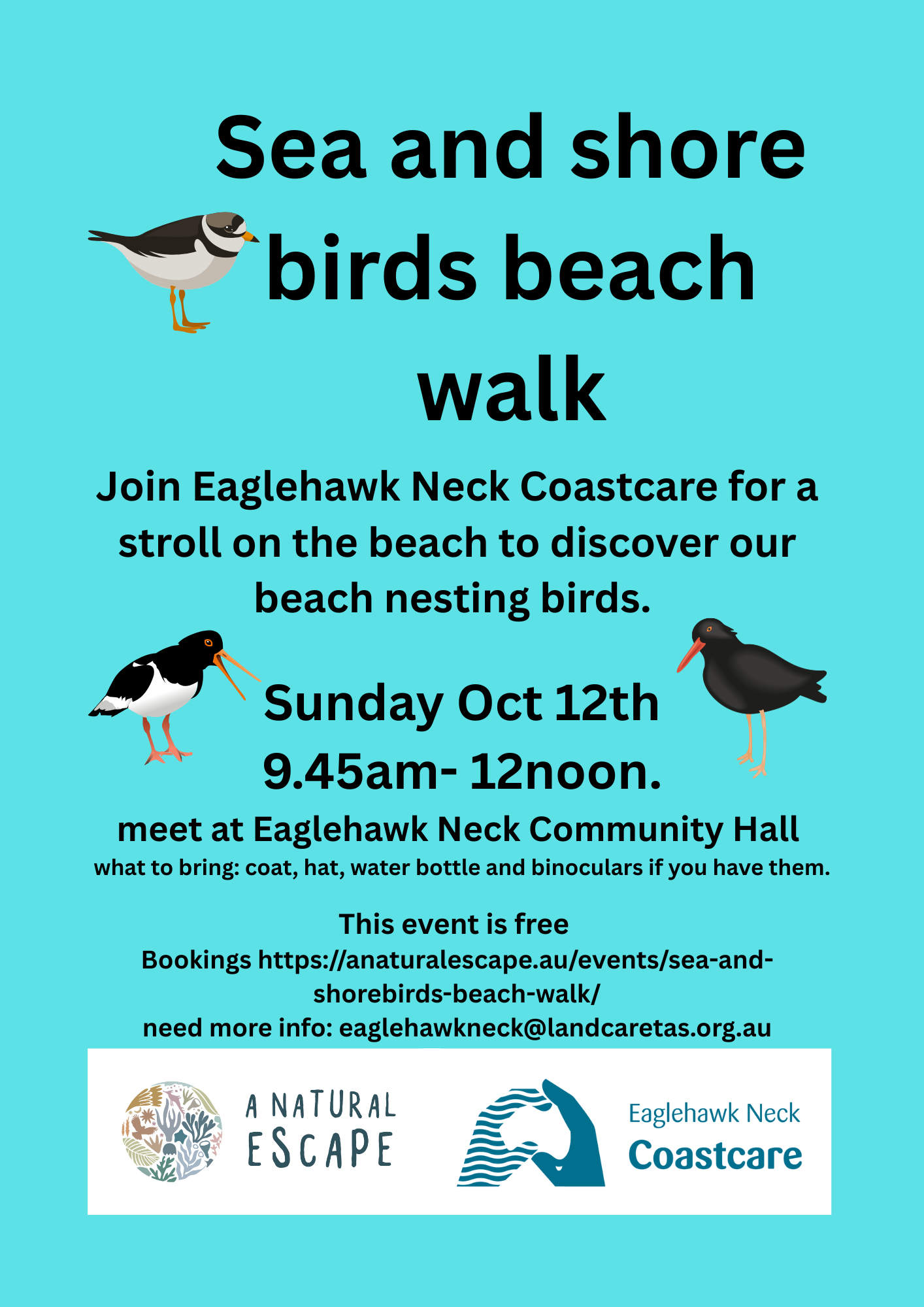 Sunday Oct 12th: Eaglehawk Neck Coastcare bird walk , we will be looking and learning about beach nesting birds on a stroll toward the Tessellated pavement and back, 10am-12 midday.